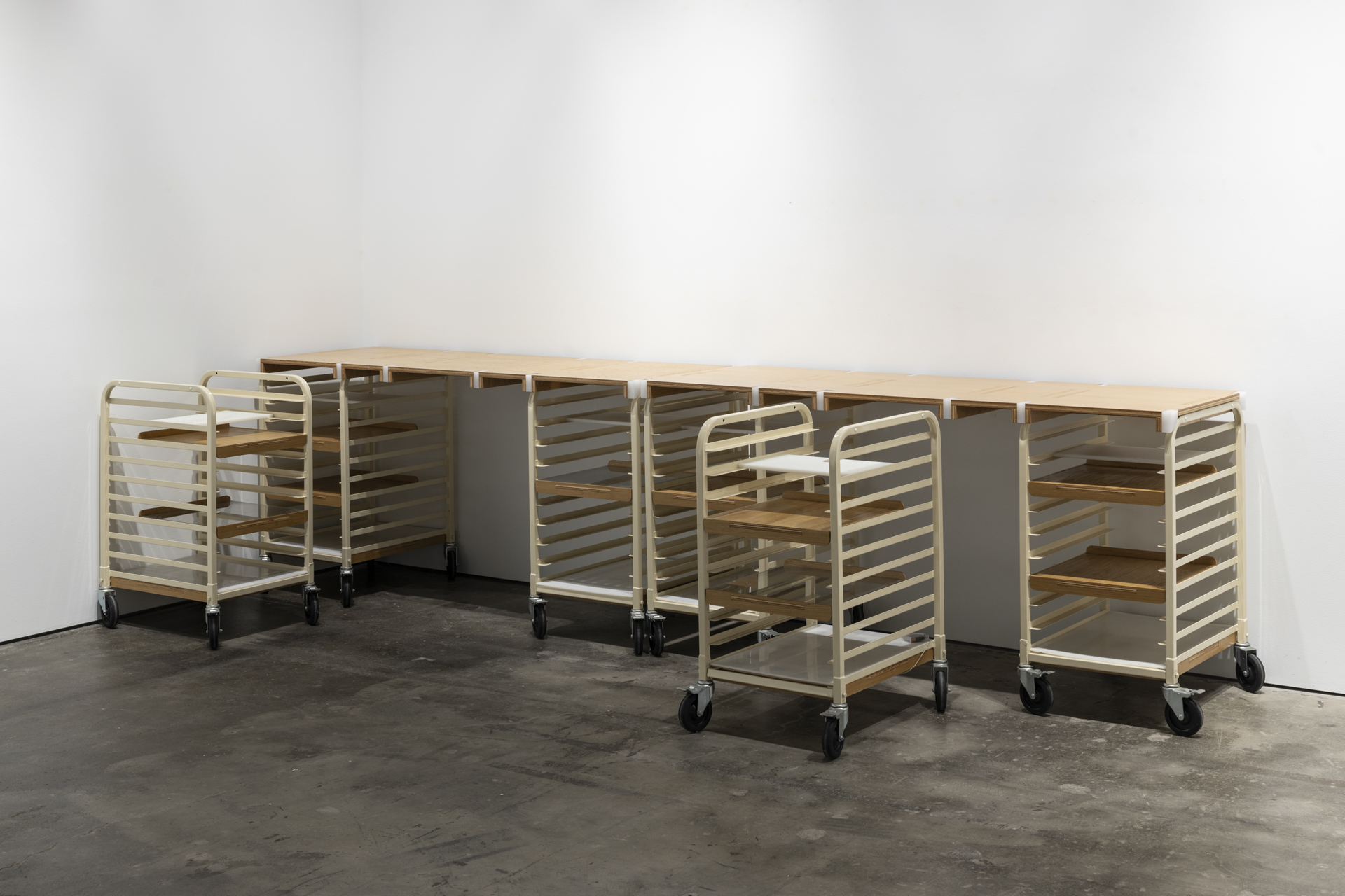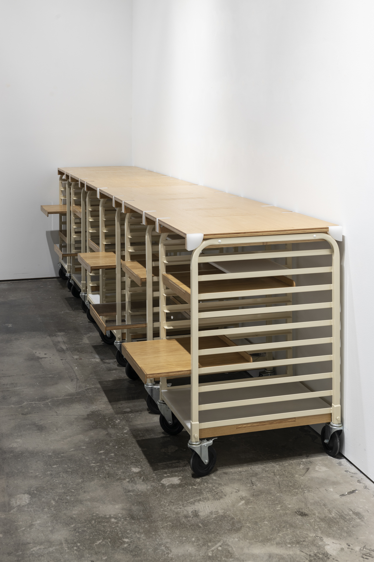 In 2017, the McEvoy Foundation in San Francisco commissioned the Kunstwagen, a versatile mobile furniture piece designed for dynamic gallery events. Crafted from plywood, polyethylene, and repurposed restaurant equipment, this reconfigurable work blends whimsy with practicality. The Kunstwagen has been used as a DJ booth, mobile bar, and a catalog display.