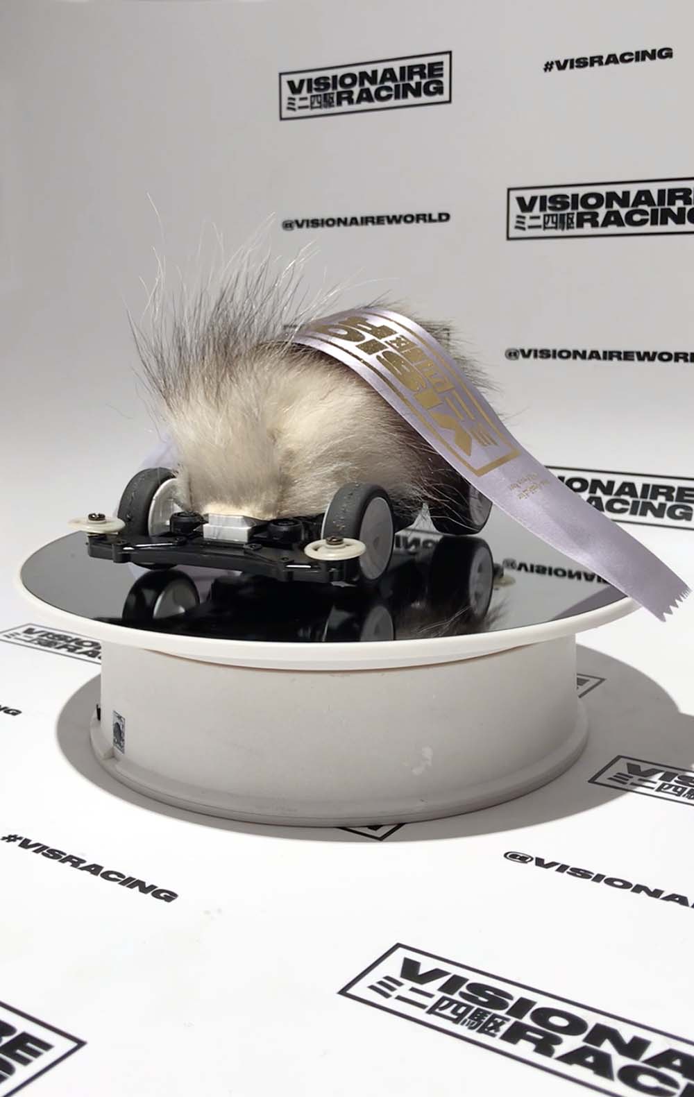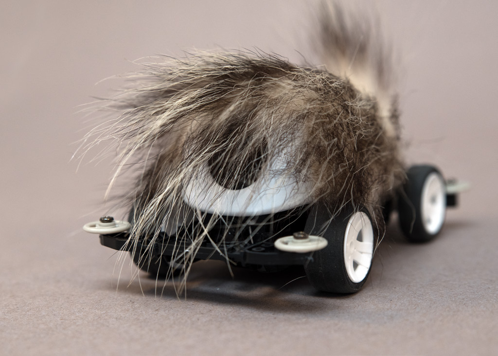 Opossum fur and vacuum-formed plastic over a Tamiya model car chassis. 3½ x 4 x 7 inches, with speeds up to 23 mph