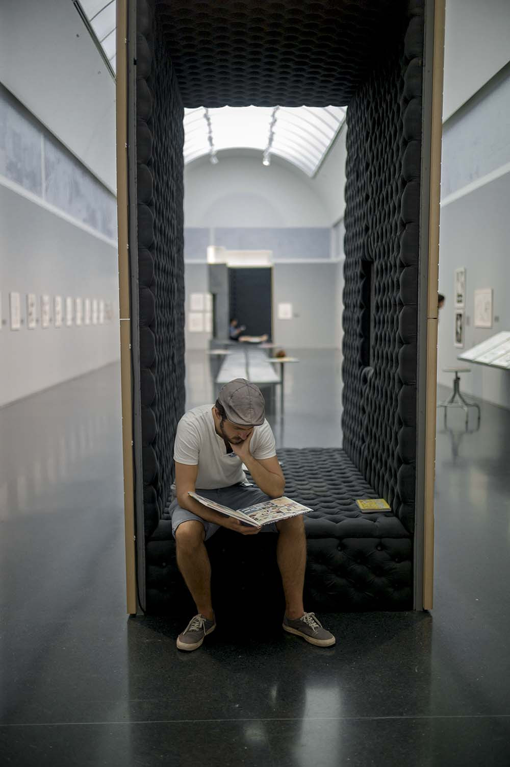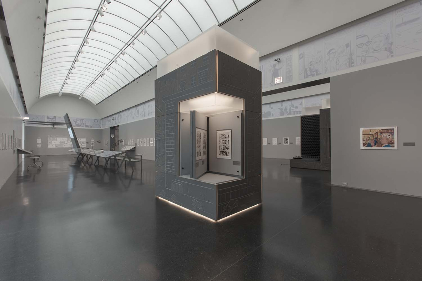 This exhibition at the Museum of Contemporary Art in Chicago was first developed as an installation for the Oakland Museum of California in 2012. A series of uncannily-scaled furnishings engaged the body of the viewer at a range of intimate scales. To create the gallery furniture, relief drawings were prepared in collaboration with Clowes, then translated into CNC-milled panels, custom upholstery patterns and fabricated steel furniture. An expanded version of the exhibition incorporated large-scale reliefs—digitally fabricated in collaboration with the artist—onto the gallery walls.
